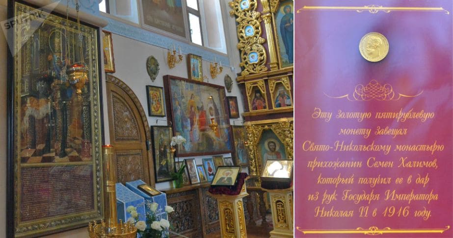 Один из могилевских подростков пронес через всю жизнь царский подарок – золотую монетку, которые Николай II раздавал на выходе из Никольского храма. 90-летний старик принес ее в храм, когда здесь появился портрет-икона. Под ее стеклом монетка хранится и до сих пор.